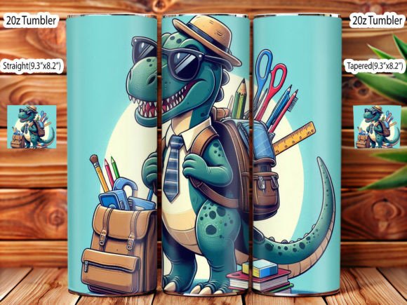 Copo térmico com desenho de dinossauro estilizado segurando mochila e material escolar