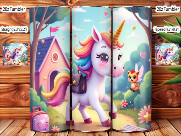 Copos térmicos coloridos com desenhos de unicórnios e cenário de floresta