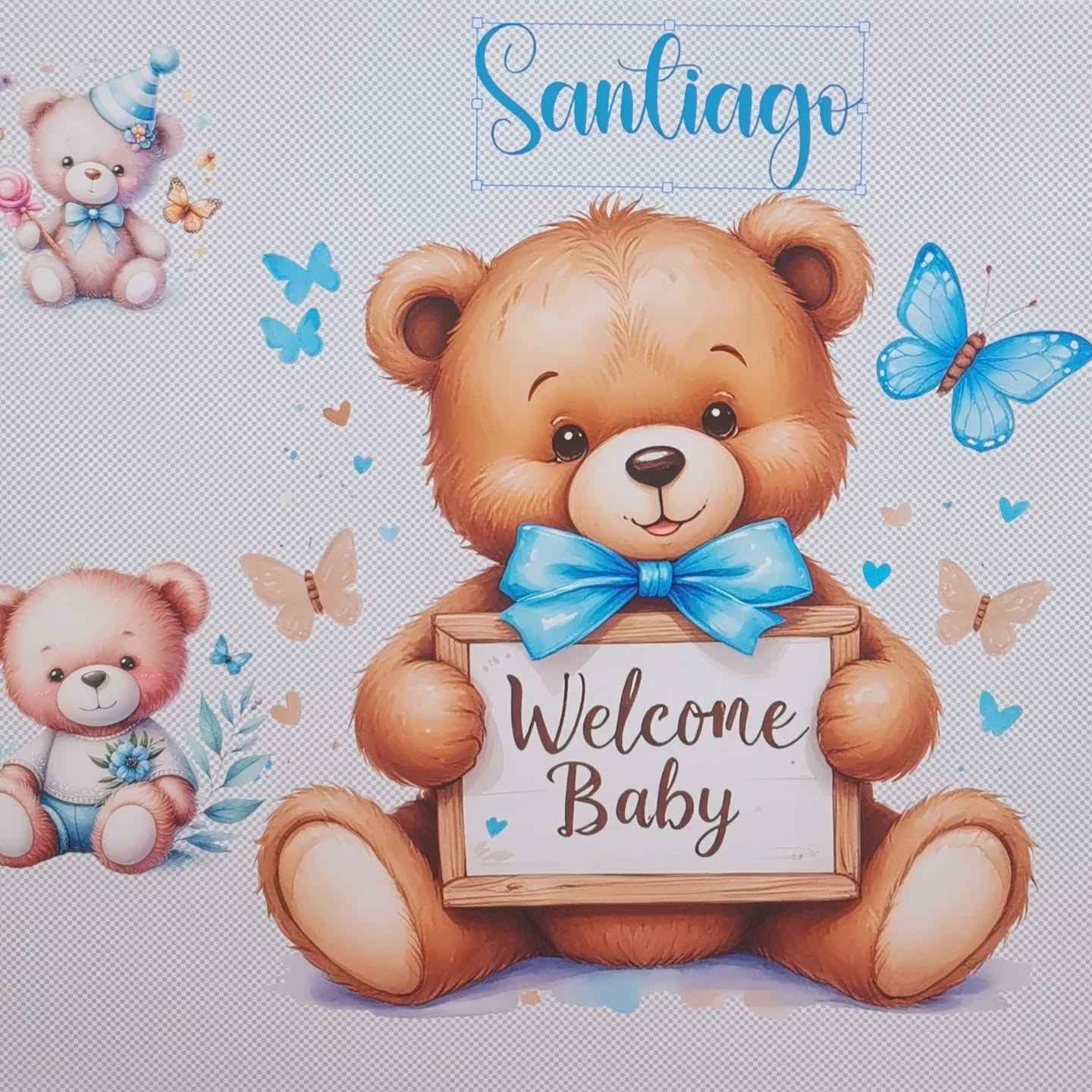 Três biberões térmicos azuis com decoração de ursinhos e texto Welcome Baby