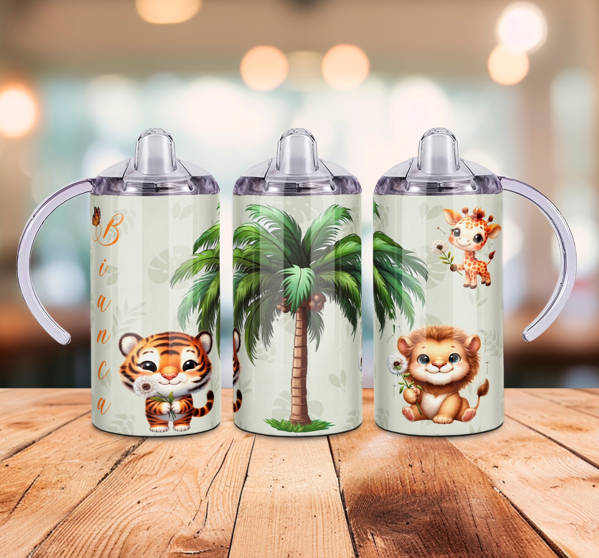 Três copos infantis com bico de silicone, alça lateral e ilustrações de animais e palmeira.