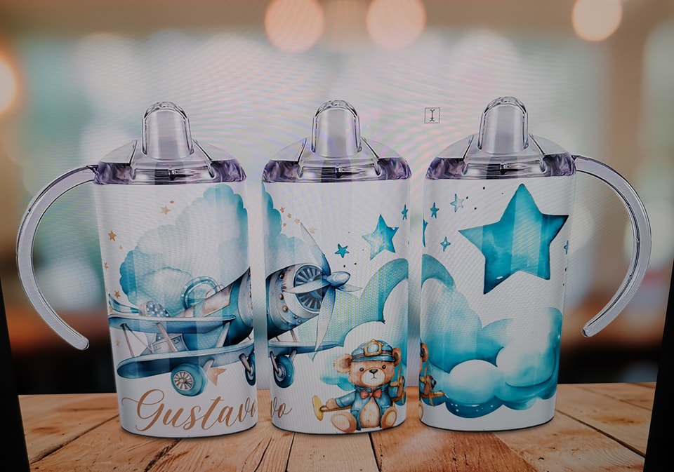 Três copos plásticos com bicos e desenhos de estrelas, nuvens e ursinho