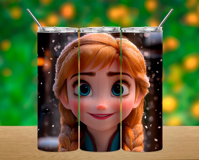 Conjunto de três copos metálicos altos com ilustração de rosto animado de rapariga ruiva e olhos verdes.