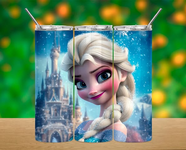 Três copos térmicos de aço inoxidável com imagem da personagem Elsa do Frozen