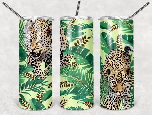 Copos metálicos com padrão de folhas e leopardos