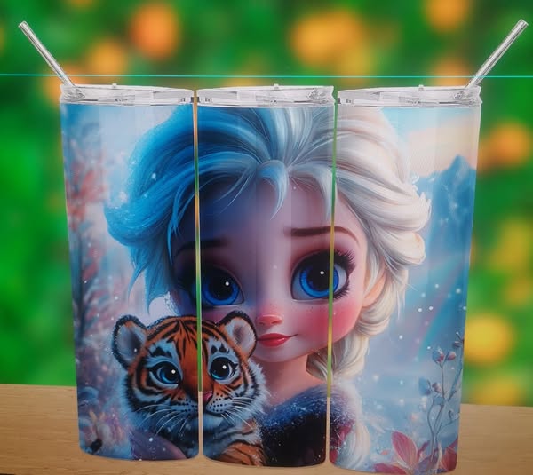 Conjunto de três copos altos com desenho de personagem de desenho animado e um tigre bebé.