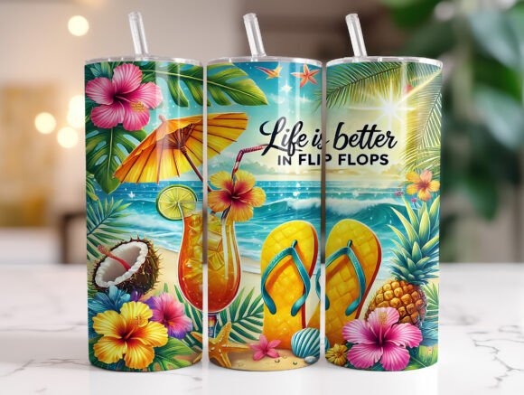 Copos térmicos tropicais com tampa e canudo e frase em inglês