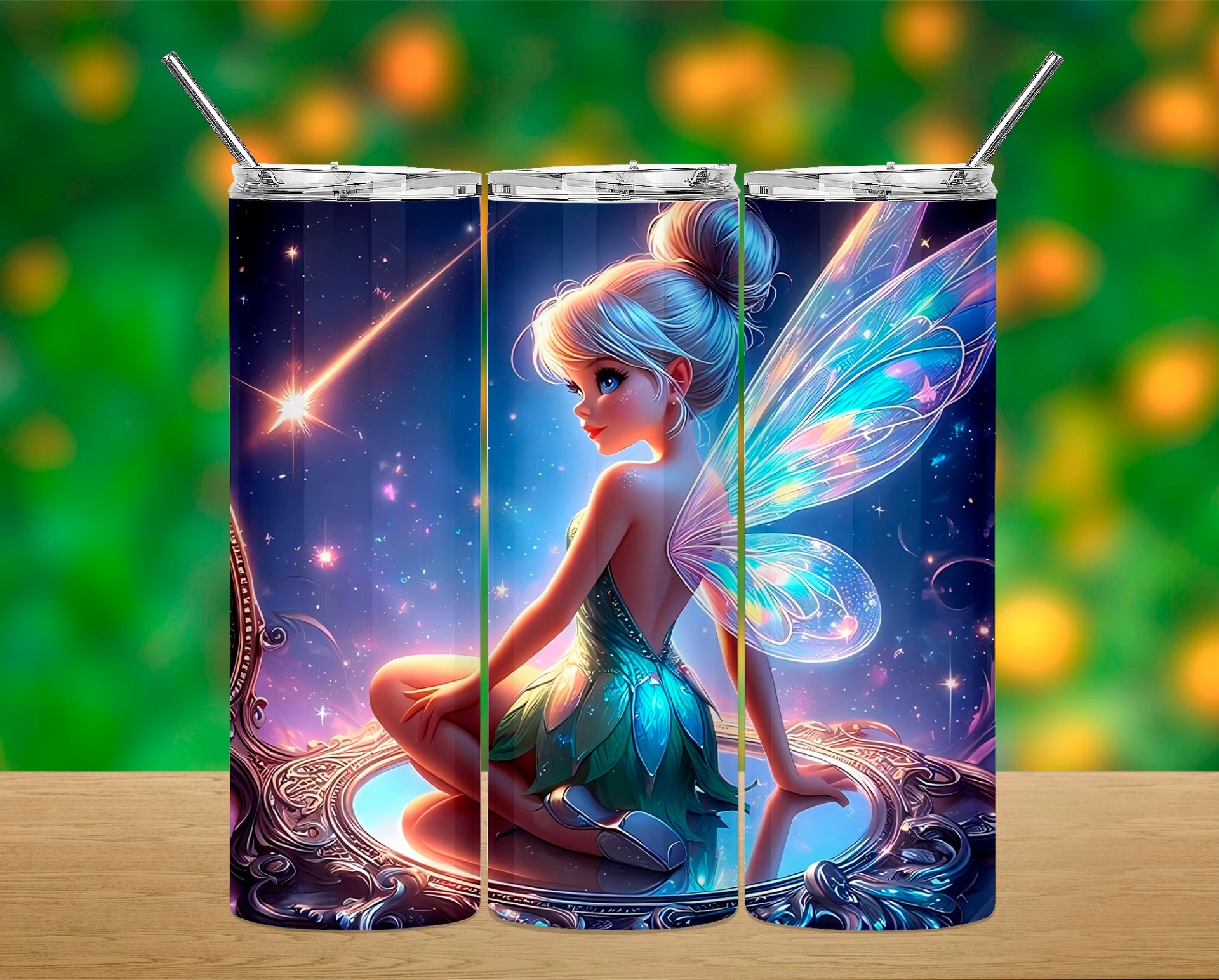 Três copos de aço inoxidável com desenho de fada colorida em ambiente estrelado.