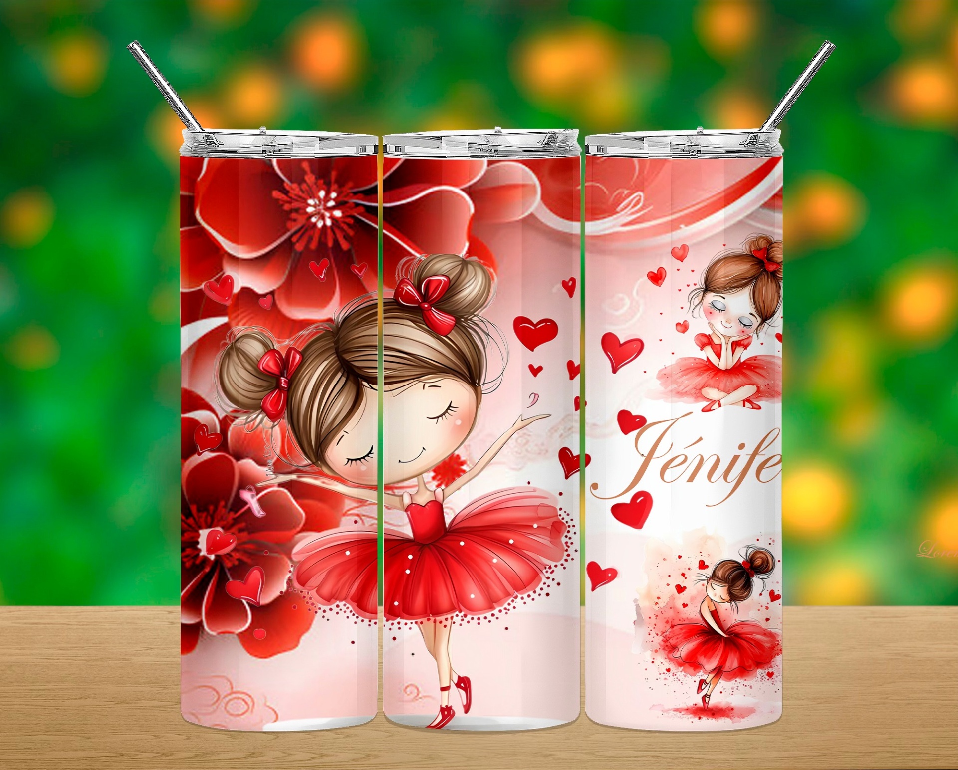 Três copos térmicos com ilustrações de menina bailarina em vestido vermelho e flores.