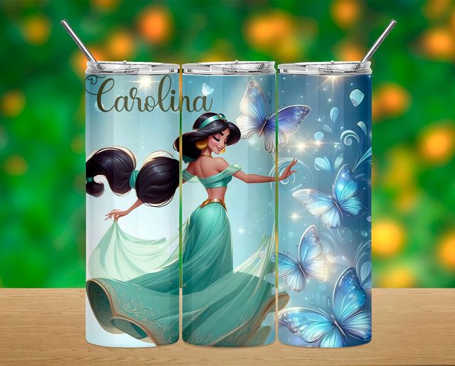 Copos térmicos com desenho de personagem feminina e borboletas azuis, nome Carolina