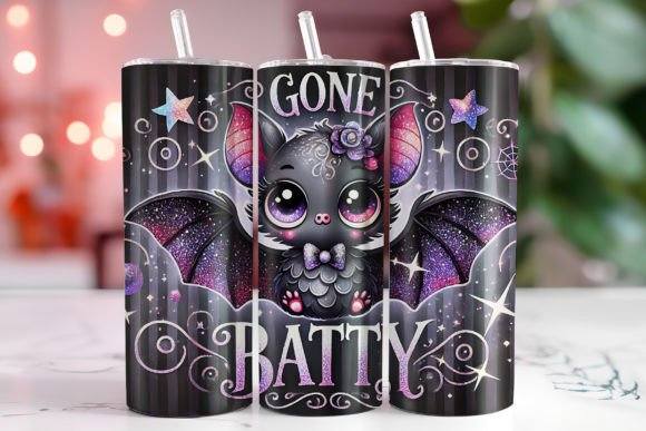 Garrafas térmicas pretas com design de morcego fofo roxo e texto 'GONE BATTY'