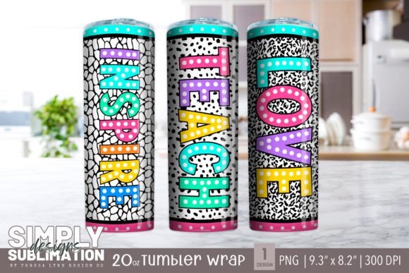 Copos térmicos coloridos com as palavras INSPIRE, TEACH e LOVE sobre bancada de cozinha
