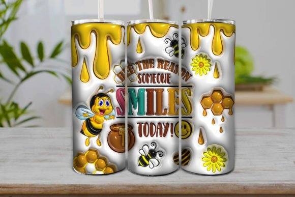 Três copos térmicos com desenhos de abelhas e mel e texto colorido