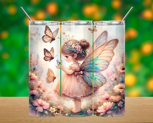 Conjunto de três copos de aço inoxidável com ilustração de fada e borboletas