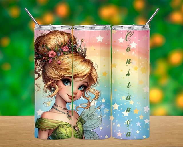 Dois copos térmicos coloridos com desenho de fada e texto CONSTANTINA