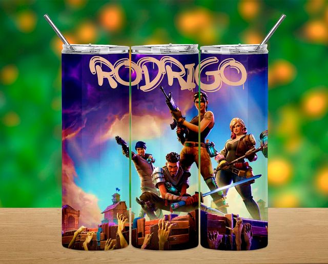 Copos térmicos metálicos com imagem de personagens armados e nome RODRIGO