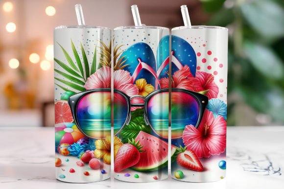 Três copos altos coloridos com tampa e canudo, decorados com flores, frutas e óculos de sol