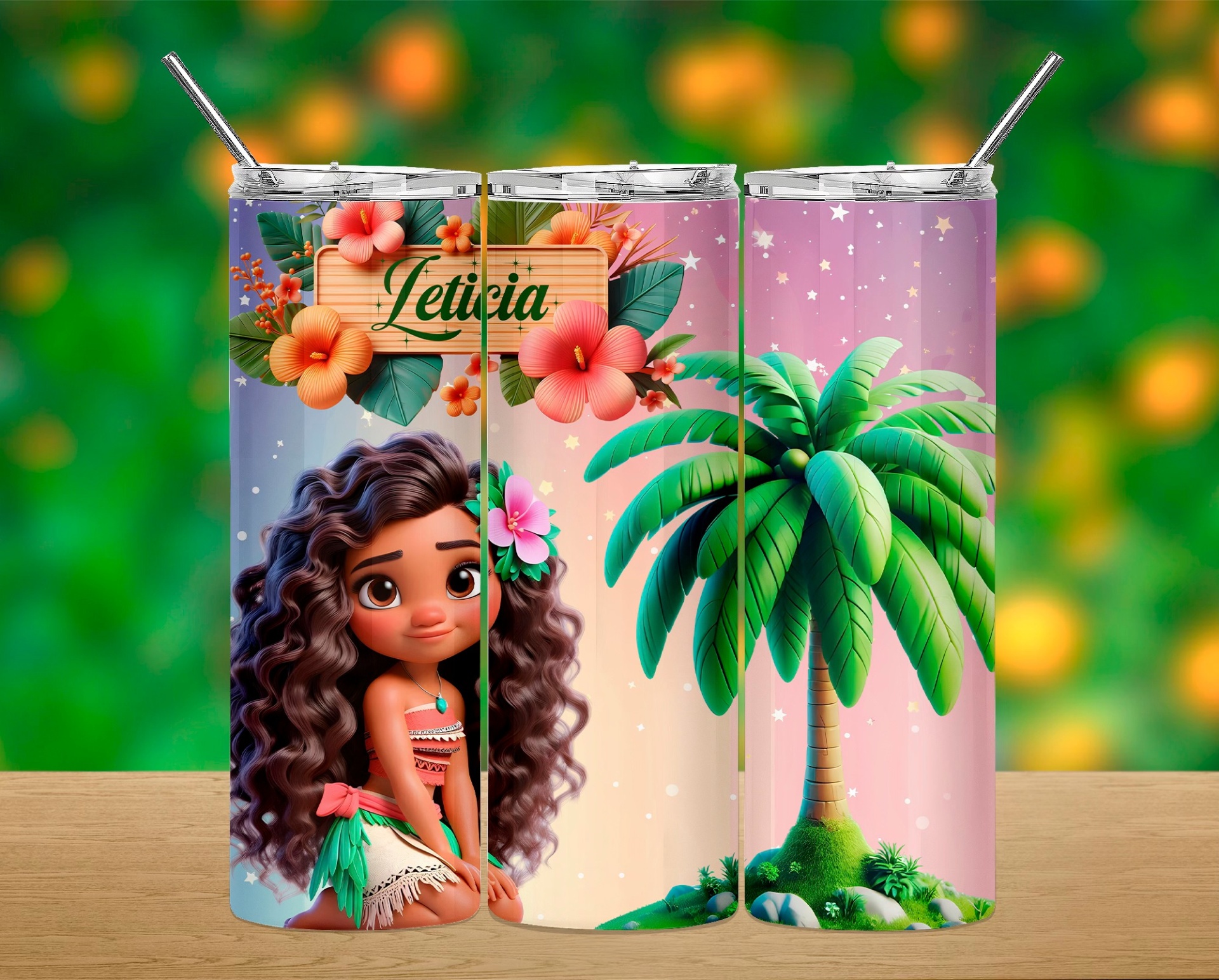 Copos térmicos coloridos com personagem feminina, palmeira e texto LETICIA