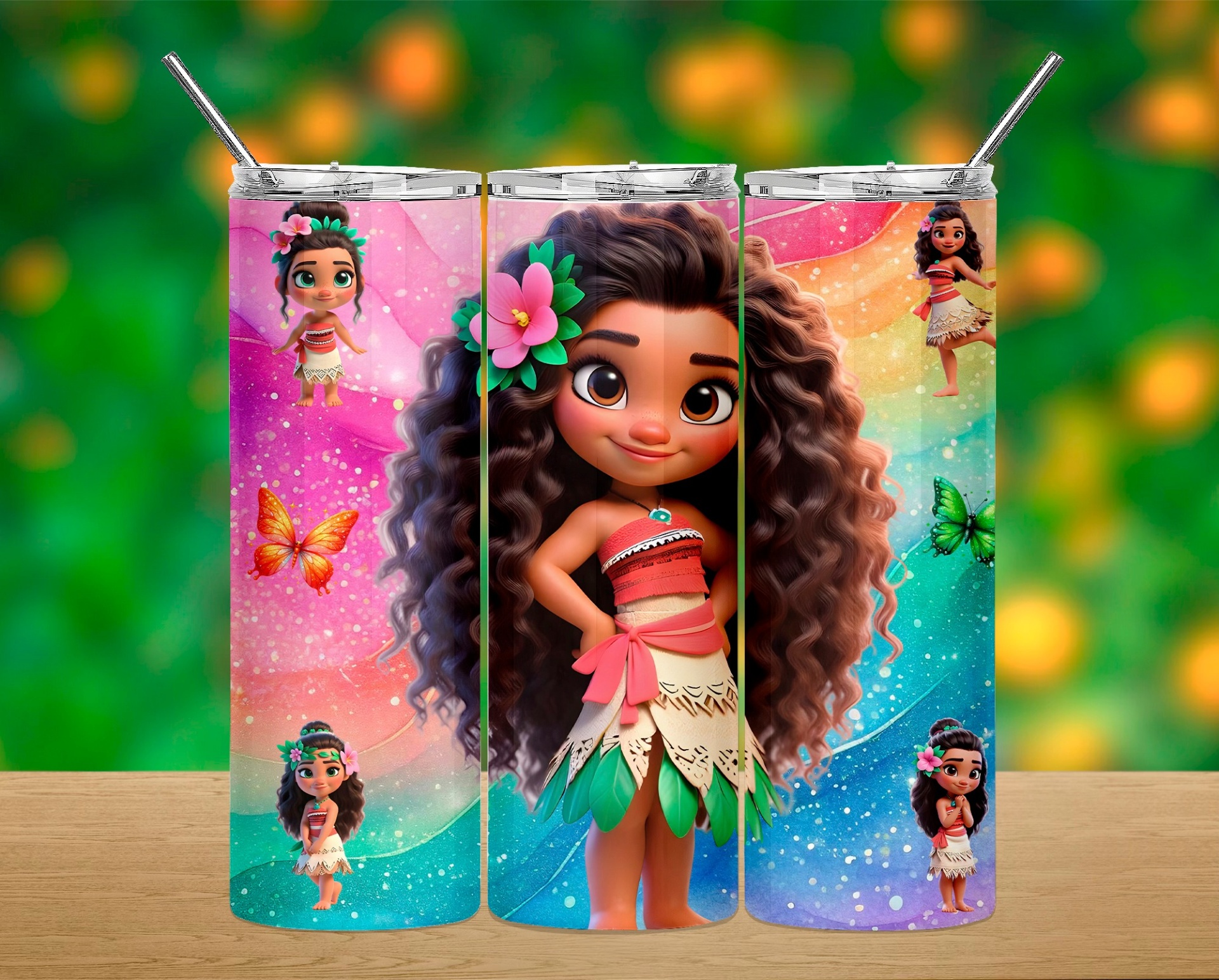 Copos metálicos com tampa e palha, decorados com tema da personagem Moana colorida