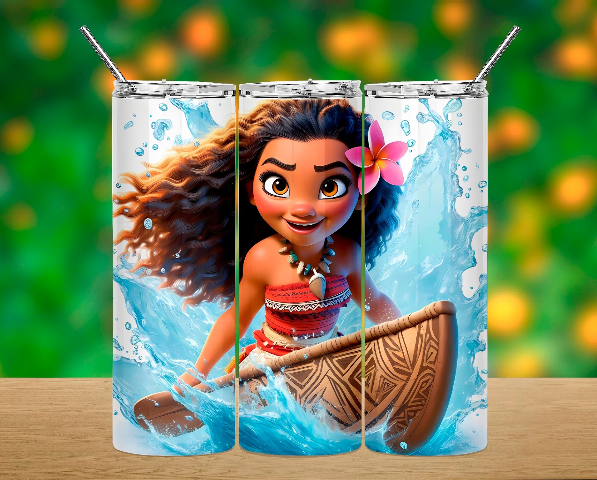 três copos metálicos altos com desenho da personagem Moana e tema aquático