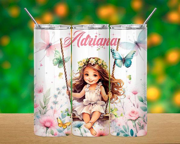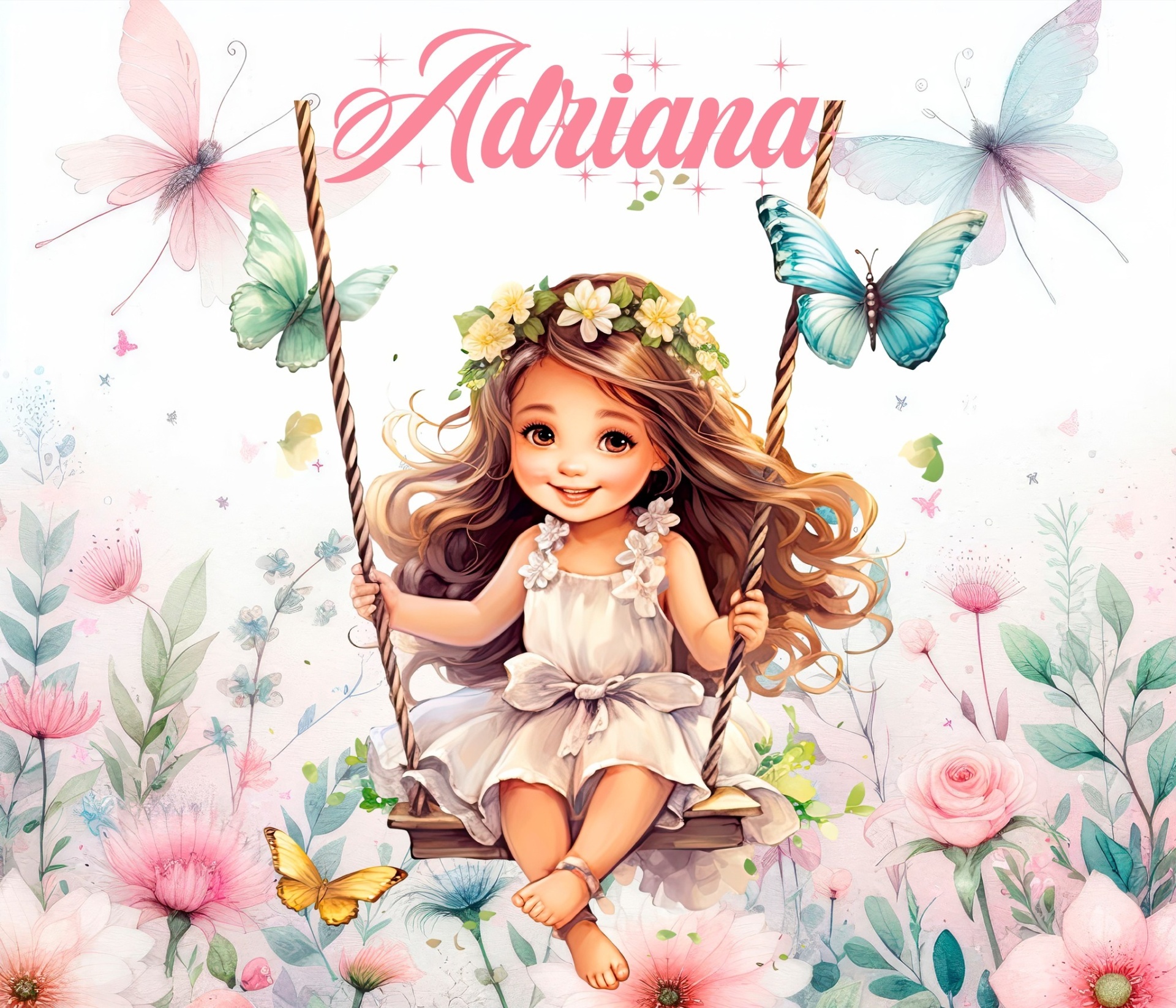 Menina com vestido branco sentada num baloiço rodeada de flores e borboletas com o nome Adriana