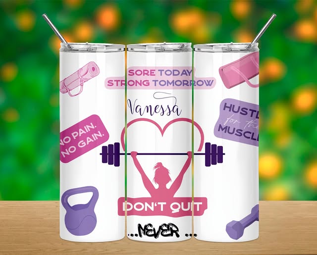 Três copos térmicos brancos com desenhos e texto motivacional de fitness