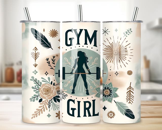 Copos metálicos decorados com flores, penas e texto GYM GIRL com silhueta feminina.